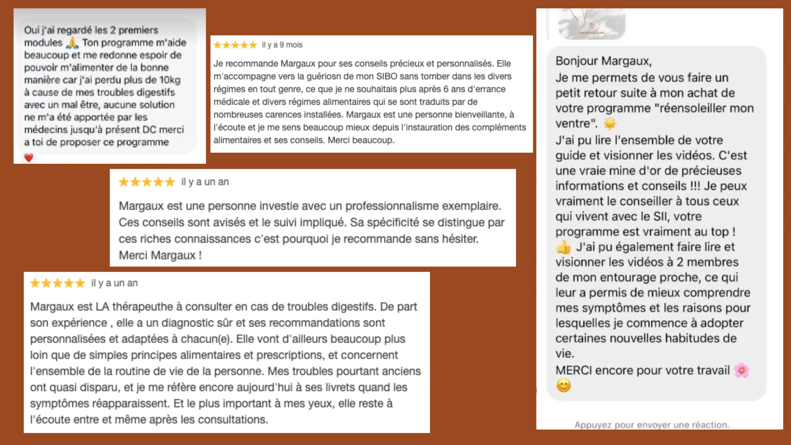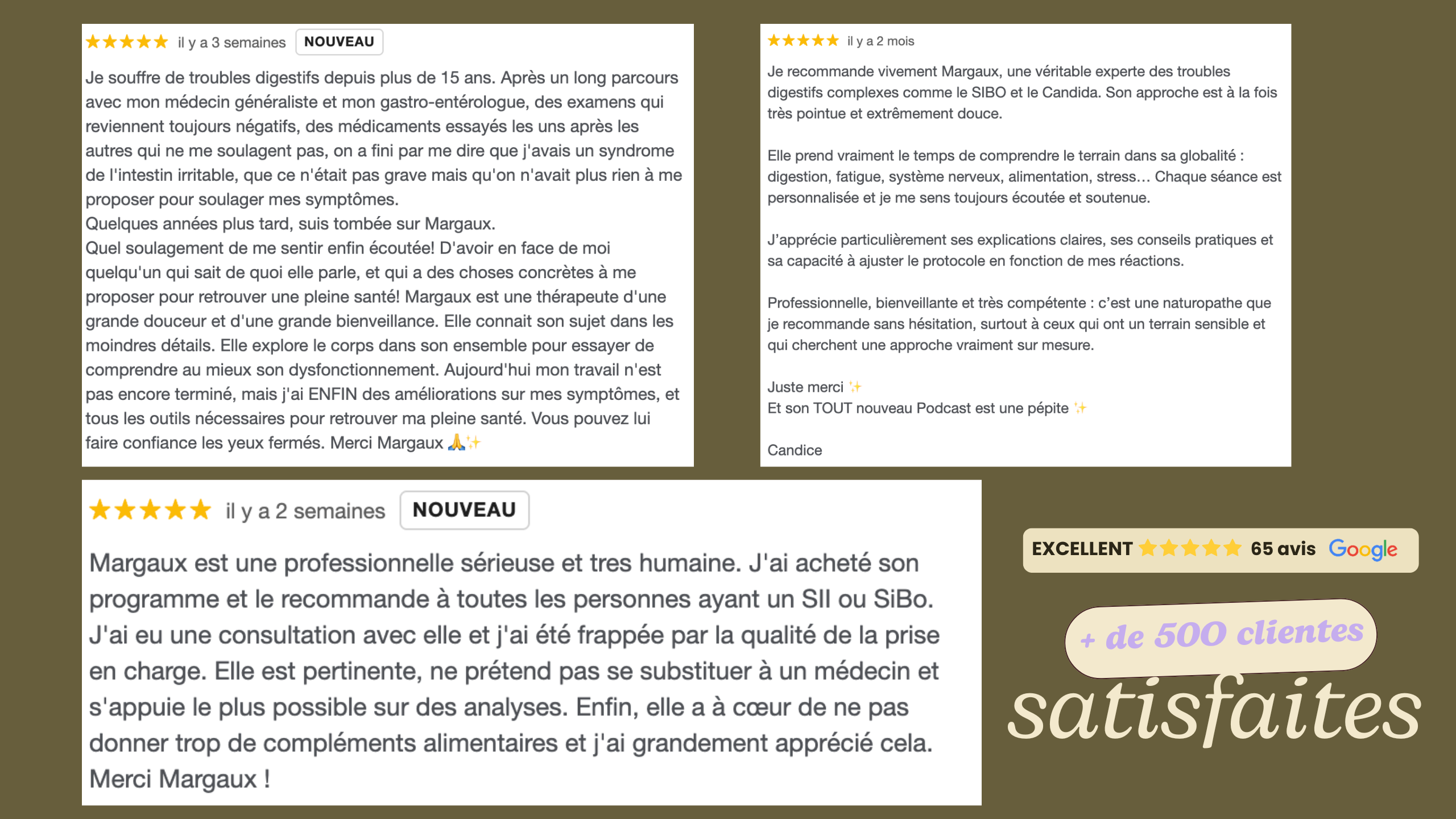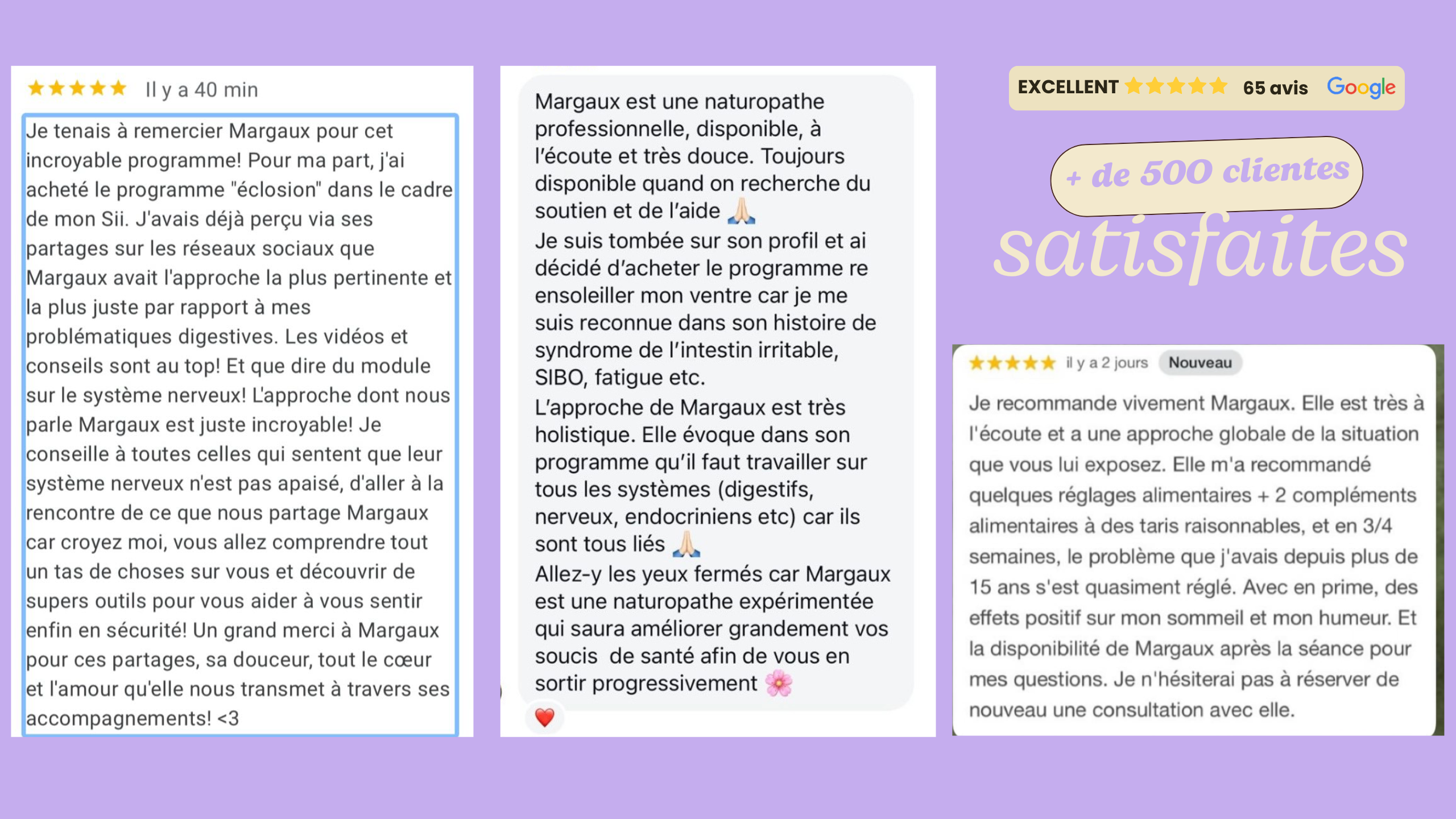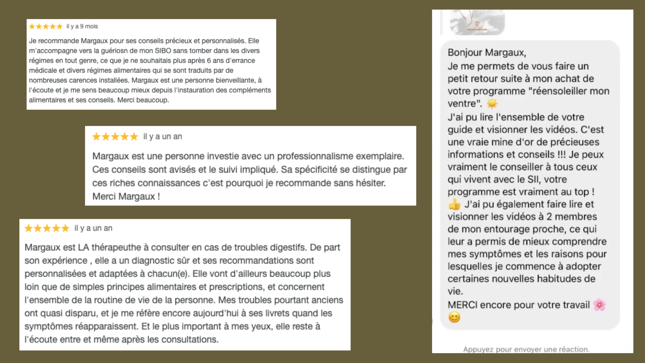 Après des années d'incompréhension de mon corps, de perte de contrôle total sur mon système digestif et de perte d'argent dans des suivis ou compléments alimentaires qui n'étaient pas adaptés pour mes troubles digestifs, j'ai choisi de créer ma méthode qui a déjà fais ses preuves auprès de + de 500 femmes !