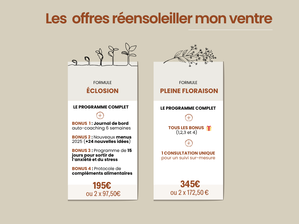 Cependant, si vous avez besoin de plus de soutien, j'ai créé la formule réensoleiller mon ventre "PLEINE FLORAISON" où tu as 1 consultation avec moi (70€ au lieu de 110€). Si tu veux aller plus loin, je peux aussi t'accompagner sur 4 ou 6 mois.