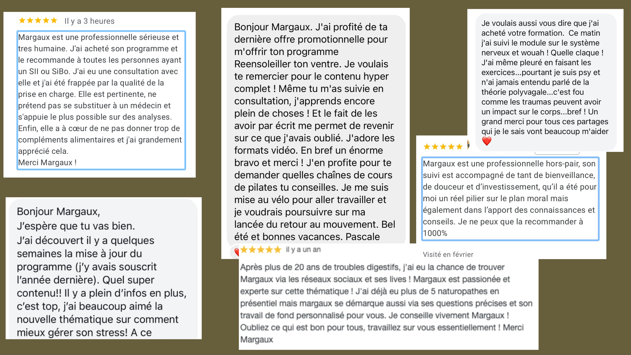 Vous pouvez toujours m’envoyer un message sur Instagram ou un e-mail à chiroismargaux@gmail.com si vous avez l’impression de stagner et surtout à tout moment vous pouvez ajouter une consultation avec moi pour faire le point sur la situation. Tu n'es jamais seule :)